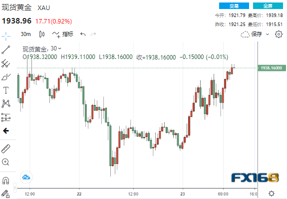 (现货黄金30分钟走势图,来源:FX168)